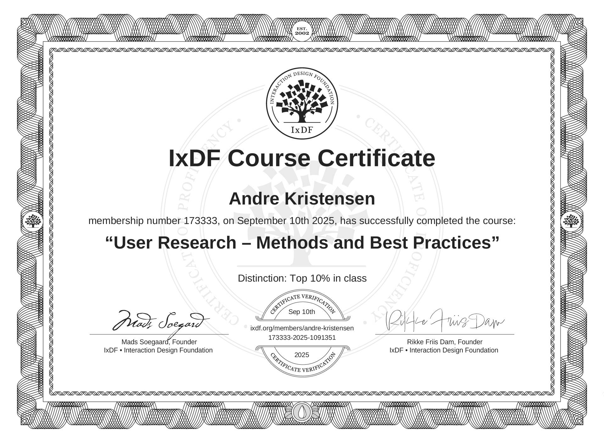 Certifikat for gennemførsel af IxDF course. Her har jeg arbejdet med struktureret research metoder, som jeg har anvendt i praksis på mit arbejde løbende. Research er det gode fundament til at finde den virkelig udfordring man skal løse for nogen.